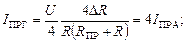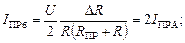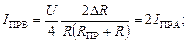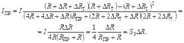 Допустим, что мост предварительно сбалансирован, т. е. I ПР = 0. Под влиянием измеряемой величины сопротивление тензорезистора изменяется на величину +∆ R 1 (растяжение). Кроме того, в результате нагревания детали, на которую наклеен тензорезистор, его сопротивление увеличивается на величину +∆ R 1Т. Остальные резисторы должны иметь ту же температуру, что и рабочий. Обычно для схемы моста выбираются резисторы с R l = R 2 = R 3 = R 4 = R. Тогда для схемы 2.2 а можно записать: