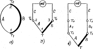 Рисунок 3.2 – Термоэлектрическая цепь (а) и схемы измерения термоЭДС термопары – без термоэлектродных проводов (б) и с термоэлектродными проводами (в):