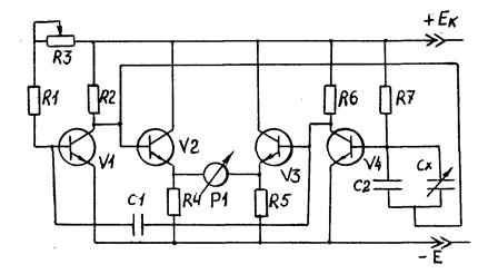Электронный измеритель уровня работает следующим образом. Симметричный мультивибратор на транзисторах V1 и V4 генерирует прямоугольные импульсы напряжений. Эмиттерный повторители, выполненные на транзисторах V2 и V3, усиливают по току эти импульсы и согласуют высокое выходное сопротивление мультивибраторов с низкоомной нагрузкой микроамперметром Р1, подключенного по балансовой схеме к эмиттерам транзисторов V2 и V3. Емкостный датчик (Сх) подключен параллельно конденсатору обратной связи С2. При изменении емкости датчика, изменяется скважность импульсов, генерируемых мультивибратором, и соответственно средний ток протекающий через микроамперметр.