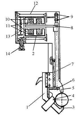 Преобразователь 2 подвешен на плоских пружинах 12 и прижимается пружиной 13 к регулировочному микрометрическому винту 14, установленному в корпусе датчика.