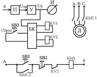 При изменении диаметра вала изменяется входной сигнал Х индуктивного преобразователя датчика (перемещение измерительного штока). Сигнал x преобразуется преобразователем П в электрическое напряжение U пp, которое усиливается усилителем У. Выходное напряжение усилителя U y, которое усиливается U y поступает на стрелочный индикатор И прибора АК-ЗМ и одновременно на блок команд БК, находящийся в электронном блоке прибора. При достижении диаметром вала значения, соответствующего предварительной команде, срабатывает реле KV1 и включает сигнальную лампочку предварительной команды (в лабораторной установке сигнал предварительной команды для управления станком не используется).