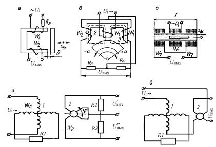 Трансформаторные датчики являются генераторными и подразделяются на две основные группы в зависимости от способа изменения взаимной индуктивности: а) с перемещающимися или поворотным якорем (рисунок 7.1 а, б, в); б) с перемещающейся обмоткой (обмотка находится на якоре) (рисунок 7.1 г, д). Датчики этого типа позволяют получить любое напряжение на выходе нагрузки независимо от величины напряжения источника питания. Во вторичной обмотке W 2 (рисунок 7.1 а) датчика индуцируется ЭДС Е 2, величина которой находится в определенной зависимости от величины зазора d. При I = const,