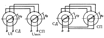 При равенстве углов поворота СД и СП ЭДС, которые наводятся в обмотках синхронизации СД и СП, равны по величине и противоположны по направлению. По обмоткам синхронизации токи не протекают, а вращающие моменты, действующие на роторы СД и СП, равны нулю.