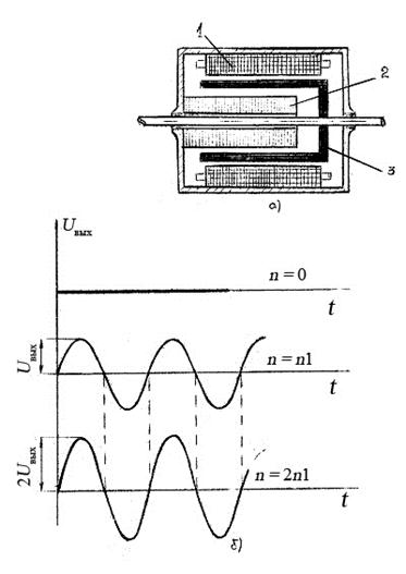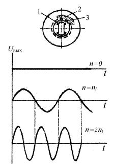 На статоре 1 расположены две обмотки, сдвинутые относительно друг друга на 90°. Одна из них является обмоткой возбуждения, другая выходной обмоткой. Ротор 3 тахогенератора выполнен в виде тонкостенного стакана, который вращается между статором 1 и внутренним неподвижным ферромагнитным сердечником 2. Обмотка возбуждения питается от сети переменного тока; в выходной обмотке наводится ЭДС переменного тока, амплитуда которой пропорциональна скорости вращения ротора, а частота равна частоте сети, питающей обмотку возбуждения. При изменении направления вращения фаза выходного напряжения меняется на обратную. Из рисунка 8.3 видно, что при различных значениях скорости вращения частота выходного напряжения не меняется, а меняется только его амплитуда.