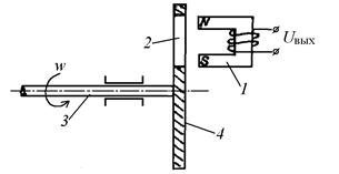 Для измерения частоты вращения применяются также импульсные индукционные датчики (рисунок 8.4), у которых выходной величиной является частота следования импульсов выходного напряжения. Такой датчик содержит постоянный магнит 1, на котором размещена обмотка и прерыватель магнитного потока, в качестве которого используются стальной диск 4 с отверстиями 2 или крыльчатка. Диск укрепляется на валу 3, скорость вращения которого нужно измерить. При вращении диска, когда отверстие окажется против катушки, воздушный зазор в магнитной цепи увеличивается, магнитный поток уменьшается. За счет изменения магнитного потока в катушке наводится импульс напряжения. Таким образом, за один оборот диска в катушке возникает один импульс напряжения, если в диске одно отверстие. Чтобы за один оборот диска получилось больше импульсов, увеличивают число отверстий. При этом частота следования импульсов будет пропорциональна скорости вращения диска. Частоту импульсов измеряют цифровым частотомером или специализированным прибором – цифровым тахометром.