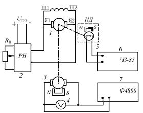 Установка состоит из двигателя постоянного тока с параллельным возбуждением 1, регулятора 2, тахогенератора постоянного тока с возбуждением от постоянного магнита 3, вольтметра постоянного тока 4, индукционного импульсного датчика частоты вращения 5 и цифрового частотомера 43-35А. На валу двигателя насажены стальная крыльчатка с 20 зубьями и тахогенератор. Рядом с крыльчаткой закреплен индукционный датчик. Крыльчатка при вращении замыкает и размыкает постоянный магнитный поток, создаваемый магнитной системой индукционного датчика, в результате чего в его обмотке наводятся импульсы напряжения, частота которого пропорциональна частоте вращения вала двигателя. Частота вращения двигателя изменяется при помощи регулятора напряжения 2. Напряжение на выходе тахогенератора измеряется вольтметром постоянного тока 4 и цифровым вольтметром 7, а частота импульсов индукционного датчика измеряется цифровым частотомером ЧЗ-35А.