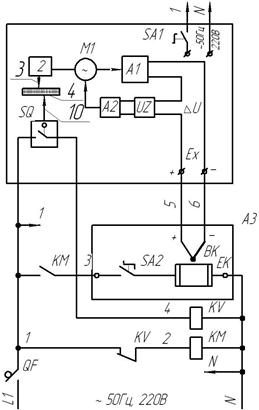 Если задатчик 10 установлен на более высокую температуру, чем та, которую в данный момент показывает прибор, то контакт микропереключателя SQ разомкнут, катушка реле КV обесточена, его контакт в цепи питания катушки пускателя КМ замкнут. Пускатель своим замыкающим контактом КМ подключает нагревательный элемент ЕК печи к сети при включенном (замкнутом) положении переключателя SA2. При повышении температуры в печи соответственно возрастает выходное напряжение термопары Ех. Разность напряжений термопары и моста D U – пропорциональное изменению температуры печи, отслеживается следящей системой потенциометра непрерывно уравновешивая измерительно-компенсационную схему (мост) А1. Одновременно стрелка 3 перемещается на величину, пропорциональную изменению температуры. Когда температура в печи повысится до заданного значения Т з, указатель 3 достигнет положения стрелки 10 задатчика, при этом контакт регулирующего устройства SQ замыкается и включает катушку реле КV. Своим размыкающим контактом KV реле обесточивает катушку пускателя КМ, его контакт КМ размыкается, отключая нагревательный элемент ЕК печи от сети.