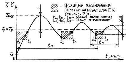Одной из оценок качества регулирования служит оценка качества переходной характеристики CAP относительно задающего воздействия. В частности, для САРТ в сушильной камере переходная характеристика представляет собой график изменения во времени температуры в печи (регулируемой величины) при отработке ступенчатого задающего сигнала Т (рисунок 9.4). На графике: Т 0 – начальное значение температуры; Т з – заданное значение температуры.