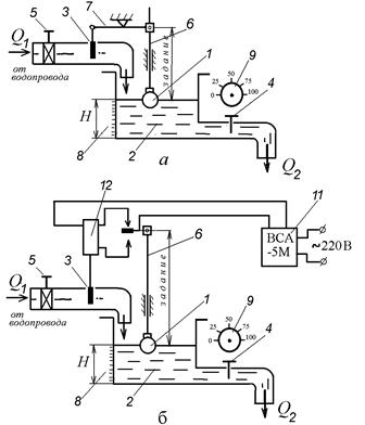 Автоматическая система статического регулирования рисунок 10.1 а (схема стенда рисунка 10.3) представляет собой систему прямого регулирования, состоящую из объекта управления 2 (бак для воды Б2) и регулирующего устройства, состоящего из поплавка 1 (П1), рычага 7 и регулирующего органа 3 (крана К1). Изменение количества вытекающей воды из бака осуществляется краном 4 (КР1), установленном на сливном трубопроводе. При работе системы вода сливается в бак (Б4).
