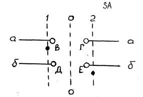 Переключатели (пакетные переключатели) – это разновидность рубильников. Переключатели имеют неподвижные и подвижные контакты, рукоятку управления. Подвижные и неподвижные контакты замыкаются в зависимости от угла поворота оси рукояткой управления. Переключатели бывают двух, трех и многопозиционные в зависимости от назначения. Условные обозначения переключателей на электрических схемах приведены на рисунке 11.2. Переключатель SA является трехпозиционным и имеет две секции, первая секция с контактами В–Г, а вторая с контактами Д–Е. Переключатель имеет три фиксированных положения 1, 0, 2, которые обозначены вертикальными штриховыми линиями. Замыкание подведенной к переключателю электрической цепи обозначается точкой напротив соответствующего положения рукоятки. Если рукоятка находится в положении 1, то будет замкнута цепь а–а, которая коммутируется первой секцией переключателя. Если рукоятку поставить в положение 2, то будет замкнута цепь б–б, которая коммутируется второй секцией. В положении 0 рукоятки обе цепи разомкнуты.