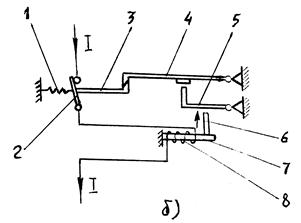 Ток I с помощью нагревательного элемента 8 нагревает биметаллическую пластину 7. При возникновении токов перегрузки биметаллическая пластина деформируется, нажимает своим штифтом 6 на рычаг 5 и освобождает защелку 4, в результате чего освобождается рычаг 3 и размыкаются контакты 2 под действием пружины 1.