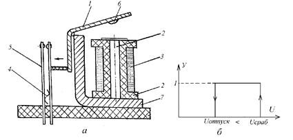 Подвижный якорь 1 притягивается к неподвижному сердечнику 2 электромагнита, по обмотке 3 которого протекает ток. Перемещение якоря приводит к замыканию контактов 5. При отсутствии тока в обмотке 3 якорь 1 и контакты 5 возвращаются в исходное состояние усилием противодействующей пружины 4. Чтобы под влиянием остаточного магнитного потока якорь не оставался притянутым к сердечнику 2, на якоре закреплен из немагнитного материала штифт отлипания 6. Якорь, сердечник и ярмо 7 реле изготовлены из магнитомягкого материала. Статической характеристикой (рисунок 11.5 б) реле является зависимость (Y) состояния его контактов (замкнуты, разомкнуты) от величины напряжения (U) на его обмотке.