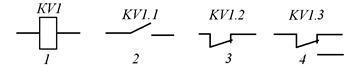 На принципиальных схемах изображают катушку KV1 реле и его контакты: KV1.1 – замыкающий; KV1.2 – размыкающий; KV1.3 – переключающий, при этом все детали реле (катушки и контакты) обозначаются одинаковыми буквенно-цифровыми обозначениями.