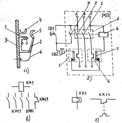 Рисунок 11.7 – Схема контактора (а), принципиальная схема подключения магнитного пускателя (б), условное обозначение контактора и магнитного пускателя (в), теплового реле (г)