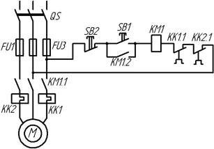 Защита двигателя от перегрузок осуществляется тепловыми реле, нагревательные элементы КК1 и КК2 которых включены в две фазы статора двигателя, а контакты КК1.1 и КК2.1 в цепь питания обмотки пускателя.