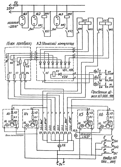 3. Посредством блока переключателей соответствующих гнезд и штекеров произвести выбор искомого КП, по сигнальным лампам объектов ТУ-ТС убедиться, что выбор КП проведен правильно.