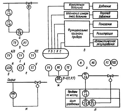 а – позиционное обозначение; б – принцип построения условного буквенного обозначения; в и г – использование для указания функциональных схем признаков приборов дополнительного буквенного обозначения; д – прибор (расположен по месту) для измерения уровня с сигнализацией верхнего и нижнего значений; е – приборы для измерения силы тока и напряжения (амперметр и вольтметр); ж – комплект приборов для регистрации расхода, давления и температуры; з – кнопка дистанционного управления и переключатель электрических цепей; и – приборы для измерения расхода показывающий, интегрирующий, установленный на щите управления (показывающий дифманометр с интегратором); к – совмещенный способ выполнения функциональных схем; л – развернутый способ выполнения функциональных схем