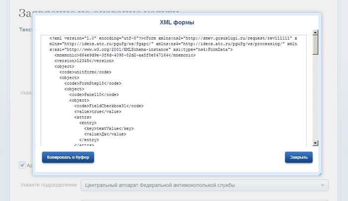 Xml созданной формы можно получить в режиме предпросмотра формы (см. п.3). При нажатии на кнопку «Перейти к подаче заявления» появится окно сформированного xml формы (Рис. 28)
