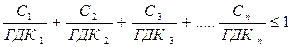 При одновременном содержимом в воздухе рабочей зоны нескольких вредных веществ однонаправленного действия сумма отношений их фактических концентраций (С1, С2, С3…...Сn) в воздухе рабочей зоны к их ГДК (ГДК1, ГДК2, ГДК3…....ГДКn) не должна превышать 1.