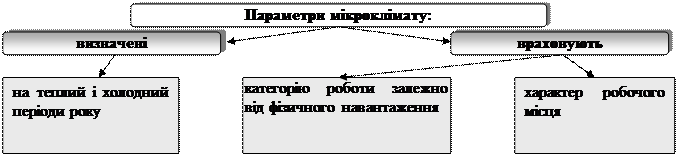| ² Параметры производственной среды ² Метеорологические параметры ² Світлотехнічні параметры ² Бароакустичні параметры ² Механические параметры ² Комфортные условия ² Дискомфортные условия ² Экстремальные условия | ² Оптимальные метеорологические условия ² Категории работ за физической нагрузкой ² Вентиляция ² Способы очистки воздух ² Кондиционирования ² Рабочее освещение ² Аварийное освещение ² Лампы разжаривания ² Лампы дневного света |