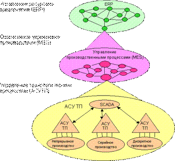 - контур управления уровня MES (оперативно-производственный) использует отфильтрованную и обработанную информацию, поступающую как от АСУТП, так и от других служб производства (снабжения, технической поддержки, технологических, планово-производственных и т.д.). Интенсивность информационных потоков здесь существенно ниже и связана с задачами оптимизации заданных производственных показателей (качество продукции, производительность, энергосбережение, себестоимость и т.д.). Типовые времена циклов управления составляют минуты, часы, смены, сутки. Оперативное управление производством в этом контуре управления осуществляется специалистами, которые более детально, чем высший менеджмент, владеют производственной ситуацией (руководители производственных цехов, участков, главные технологи, энергетики, механики и др.). В связи с этим должно повышаться качество и эффективность принимаемых решений в пределах делегированных сверху полномочий.