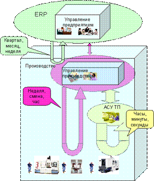 - контур управления уровня ERP (стратегический) освобождается в этом случае от решения оперативных задач производства и обеспечивает поддержку бизнес-процессов предприятия в целом. Поток информации от производственного блока становится минимальным и включает в себя агрегированную управляющую и отчетную информацию по стандартам ERP с типовыми временами контроля (декада, месяц, квартал), а также "алармовые" сигналы, требующие немедленного вмешательства высшего менеджмента предприятия.