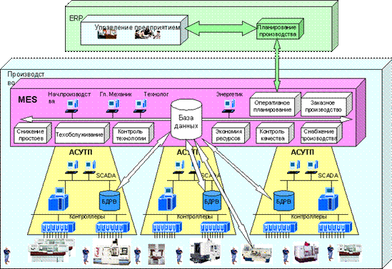 - средний уровень управления (производственный) решает задачи оперативного управления процессом производства, а соответствующая автоматизированная система обеспечивает эффективное использование ресурсов (сырья, энергоносителей, производственных средств, персонала), а также оптимальное исполнение плановых заданий (сменное, суточное, декадное, месячное) на уровне участка, цеха, предприятия;