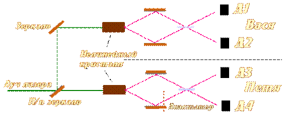 Лазерный луч с помощью полупрозрачного зеркала расщеплялся на два пучка, а затем каждый из пучков направлялся на так называемый нелинейный кристалл, т.е. преобразователь частоты, способный расщеплять квант света (фотон) на два дочерних кванта. Закон сохранения энергии при этом, конечно же, выполняется: энергия каждого из дочерних квантов вдвое меньше энергии материнского кванта. Например, если падает лазера с длиной волны 405 нм (зелёного цвета), то на выходе из кристалла будут два луча с длиной волны 810 нм (красного цвета), энергия каждого кванта которых вдвое меньше энергии кванта в исходном луче. Затем, с помощью системы зеркал, делалось так, что каждая из этих двух пар фотонов интерферировала между собой, примерно так, как интерферировали компоненты суперпозиции в нашем опыте с рассеянием электронов на двух щелях. Результаты наблюдения интерференционной картины фиксировались детекторами Д1-Д2 для первой пары фотонов, и детекторами Д3-Д4 - для второй пары.
