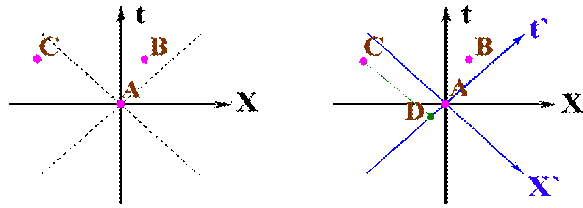 Качественно это можно проиллюстрировать следующим образом. В ЛСО, как это видно непосредственно из графика, событие A предшествует событию C. Выберем систему отсчёта ракеты, летящей в ЛСО вправо с достаточно большой скоростью.. Эта система отсчёта схематично показана синими осями на правой части рис. 5, она как бы "повернулась" относительно лабораторной системы в сторону движения ракеты. Нетрудно видеть, что проекция события C на ось времени (пусть это будет событие D) лежит до события A. То есть в системе отсчёта ракеты событие D предшествует событию A. Имейте, правда, в виду, что аналогия между преобразованием Лоренца и вращением декартовой системы координат, которую мы только что использовали, не всегда корректна: в первом случае мы имеем дело с вращениями в пространстве Минковского, а во втором - с вращениями в евклидовом пространстве. Но для нашего случая эта аналогия вполне годится.