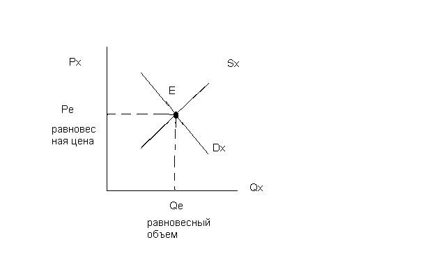Совмещая на графике линии спроса (Dx) и предложения (Sx), получаем графическое изображение равновесия в координатах «цена – объем». Точка Е отражает возникновение равенства между объемом спроса и объемом предложения. В этой точке пересекаются кривые спроса и предложения, ей соответствуют равновесная цена (Pe) и равновесный объем (Qe).