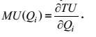 Максимум удовлетворения достигается в точке В, когда предельная полезность становится = 0. Это означает, что благо полностью удовлетворяет потребность. Математически предельная полезность товара есть частная производная общей полезности товарного набора по объему потребления i-ого товара: