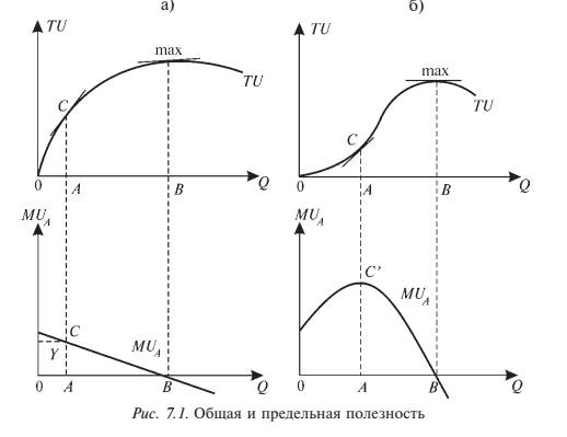 Геометрически (рис 7.1.а) значение предельной полезности = тангенсу угла наклона касательной к кривой TU в точке С. С увеличением объема потребления товара угол наклона этой касательной уменьшается и, следовательно, понижается предельная полезность товара. Если дальнейшее потребление блага приносит вред (предельная полезность блага отрицательная), то общая полезность снижается.