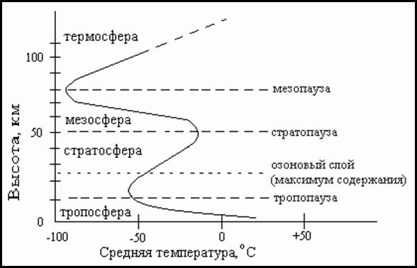 По характеру изменений температуры с ростом высоты различают несколько сфер, разделенных узкими переходными зонами, называемыми паузами.