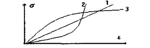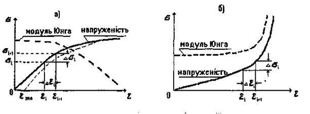 Із формули (1.69) випливає, що модуль Юнга в певній точці діаграми є похідною dotdε та чисельно дорівнює тангенсу кута нахилу дотичної, проведеної в цій точці. Закономірності зміни модуля Юнга для діаграм деформацій, які тут розглядаються, приведені пунктиром на мал. 1.34.