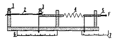 1. Ознайомтесь з макетом для розтягу волосини (мал. 1.35). Волосину 2 закріплюють між двома зажимами (нерухомим - l і рухомим - 3). За шкалою б знімають початковий l0 і поточні розміри l волосини при її деформації. За рухомою шкалою 7 визначають величину зовнішньої сили F, яка розтягує волосину і яку можна змінювати, розтягуючи пружину 4 переміщенням штока 5. Шкала 7 проградуйована в Ньютонах.