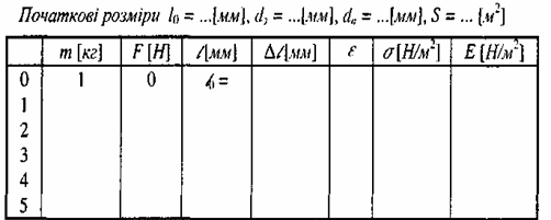 3. Занесіть в таблицю значення початкової довжини dз, зовнішнього dвта внутрішнього de діаметрів зразка.