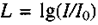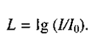 =10 Вт/м2 (поріг больового відчуття), тобто відношення інтенсивностей звуків для цих порогів становить величину 10 '. У зв'язку з цим для порівняння інтенсивностей звуку зручно ввести логарифмічну шкалу рівнів інтенсивності, тобто порівнювати не інтенсивності звуку, а їх логарифми. Рівень інтенсивності звуку, який відповідає порогу чутності, приймають за нульовий рівень шкали. Рівень іншої інтенсивності L іншого звуку виражають через десятковий логарифм відношення І/І0:
