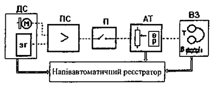 ДС - джерело звукових сигналів, це генератор звукових частот (ЗГ) для тональних аудіометрів або мікрофон (М) (магнітофонний запис сигналу) для мовного аудіометра, деякі аудіометри крім цього містять і генератори шумів;