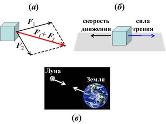 Рис. 8. (а) – определение результирующей силы методом параллелограмма; (б) возникновение силы трения при скольжении одного тела по поверхности другого; (в) гравитационные силы взаимного притяжения
