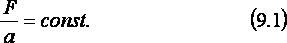 Если взять какое-нибудь тело и, действуя на него с определённой силой, измерить его ускорение, а потом повторить измерения для нескольких других величин силы и построить график, то окажется, что все точки лежат на одной прямой (см., например, голубую прямую на рис. 9а). Значит, отношение силы F к ускорению a, которое она вызвала, является постоянной величиной (const) для данного тела, что можно записать в виде: