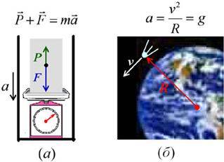 Рис. 12. (а) – определение веса тела P на пружинных весах в кабине лифта, движущегося с ускорением a; (б) – к выяснению причин невесомости на искусственном спутнике.