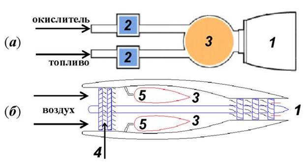 Рис. 15.Схематическое изображение ракетного (а) и воздушно-реактивного (б) двигателей.