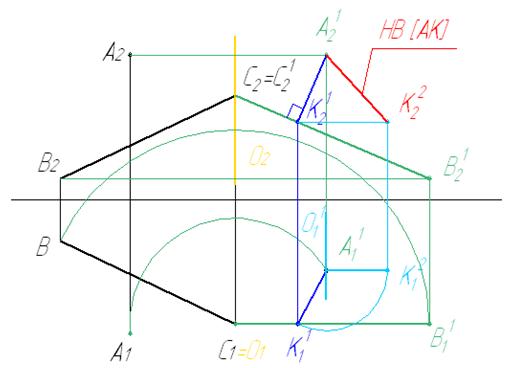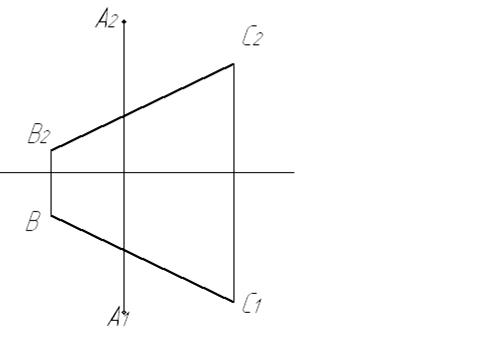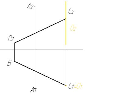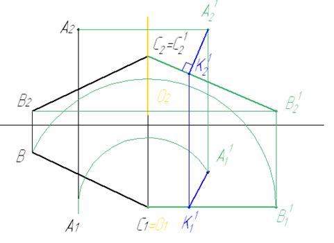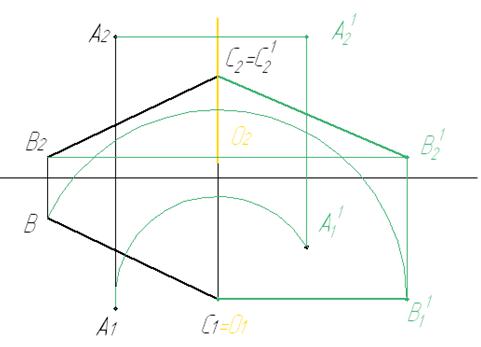 2 Вращаем проекцию отрезка В1С1 до положения параллельно оси Х. Достраиваем вторую проекцию отрезка и новое положение точки А. В результате получаем отрезок прямой уровня.