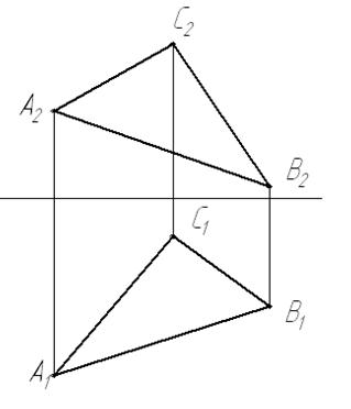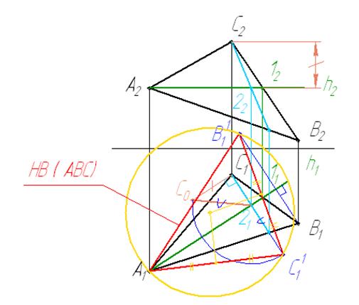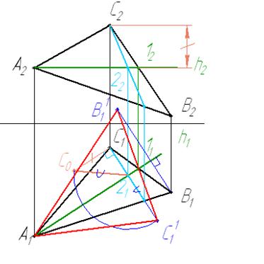 3 Проводим траектории движения точек. Откладываем на траектории радиус вращения и достраиваем недостающие точки треугольника. Получаем натуральную величину треугольника АВС.