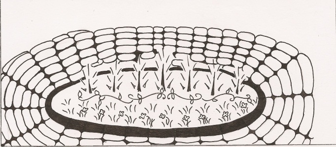 Арабеска - затейливый сложный орнамент из геометрических узоров: завитков, окружностей, линий. Арабески обычно устраиваются на фоне газона как самостоятельный элемент или используются при оформлении ковровых клумб, цветников. Особенно эффектно они выглядят на склонах выполняются из битого кирпича, ракушечника, мраморной крошки и т.п.
