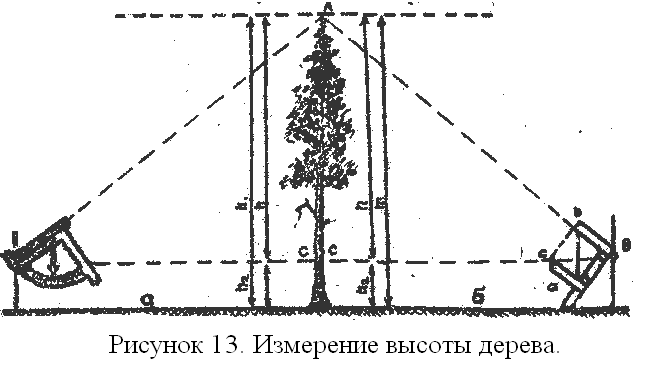 Высота дерева определяется разными способами, в том числе применением подручных средств для выявления соотношения роста человека и высоты дерева. Но более точные данные получаются при определении высоты мерной вилкой и высотомером. При работе мерной вилкой, отойдите от дерева на расстояние примерно равное его высоте так, чтобы хорошо была видна вершина дерева. Измерьте рулеткой расстояние от точки наблюдения до ствола дерева с точностью до 1 м. После этого отодвиньте стойку вилки на столько сантиметров, сколько метров было отмерено от дерева до наблюдателя, и закрепите ее стопором. Неподвижную ножку по нижнему краю визируйте на вершину дерева. В это время отвесная нить покажет деление на подвижной стойке. Этот отсчет в сантиметрах покажет высоту дерева в метрах от уровня глаз наблюдателя до вершины. К полученной высоте надо прибавить рост наблюдателя, до глаз (см. рисунок Б). При определении высоты дерева высотомером надо отмерить от дерева 10 или 20 метров. Удерживая маятниковый высотомер в правой руке, надо визировать его на вершину дерева так, чтобы она была в центре кружка трубки. При этом указательным вальцам левой руки нажимаем на гайку оси маятника высотомера. При наведении трубки на вершину дерева (в момент остановки маятника) палец левой руки снимается с гайки - стопорная пружина зажимает стрелку маятника. После этого надо сделать отсчет по 10-или 20-метровой шкале, в зависимости от того, на каком расстоянии от дерева измерялась его высота. Деление на шкале высотомера покажет высоту дерева от вершины до уровня глаз наблюдателя, поэтому к полученному отсчету надо прибавить рост наблюдателя (см. рисунок Б). Перед измерением высоты дерева надо проверить исправность высотомера. В горизонтальном положении визирной трубки маятник должен находиться на нуле. Гайка фиксатора при, нажатии не должна мешать стрелке свободно передвигаться.