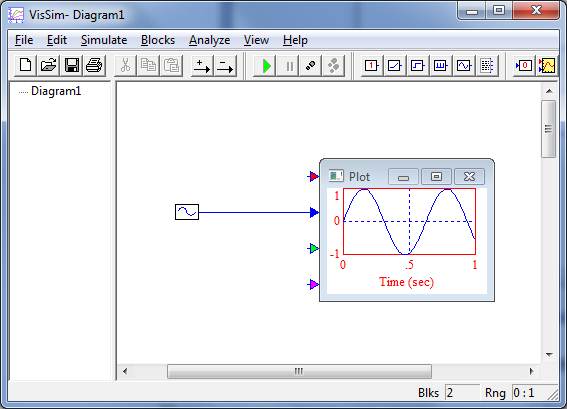 Диаграммой в VisSim называется совокупность связанных, а также автономных блоков и надписей, помещенных на рабочее пространство и способных функционировать при запуске процесса моделирования. Диаграмма может быть сохранена в виде отдельного файла и, при необходимости, открыта вновь.