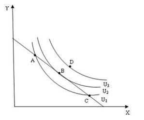 На рисунке точкой оптимального поведения потребителя (положения равновесия) является точка А, В, С или D? Обоснуйте ответ.