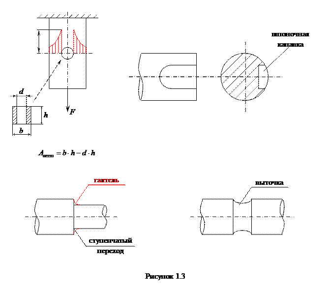 Аналогично принципу Сен-Венана резкое изменение напряжений, то есть концентрация напряжений, наблюдается в местах, где изменяется поперечный размер сечения бруса, Таким образом, концентраторами напряжения являются отверстия, различные выточки, ступенчатые переходы, шпоночные канавки и так деле и тому подобное (рисунок 1.3).