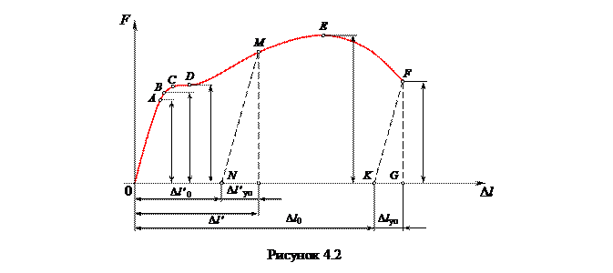 Для испытаний на растяжение применяют разрывные машины, позволяющие в процессе испытания определять усилия и соответствующие им деформации образца. По этим данным строят первичную диаграмму растяжений, в которой по оси ординат откладывают усилия, а по оси абсцисс – соответствующие им удлинения. Диаграмма растяжения может быть получена и автоматически при помощи специальных диаграммных аппаратов. Характер диаграммы растяжения зависит от свойств испытуемого материала. Типичный вид такой диаграммы для малоуглеродистой стали изображен на рисунке 4.2.